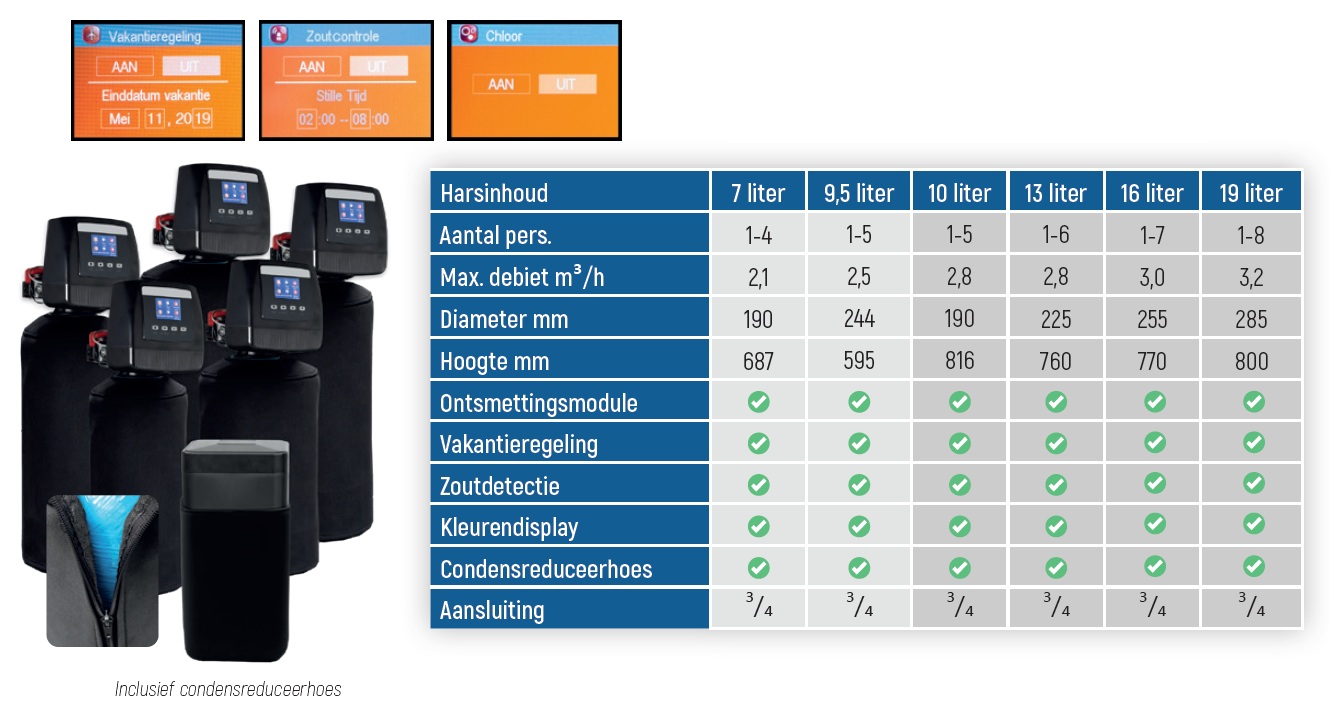 Dankzij de gemakkelijk in te stellen regeneratiecyclus wordt langdurig stilstaandwater voorkomen en daarmee bacterievorming tegengegaan. Ook beschermt de schuifafsluiter de printplaat en het display tegen zoutdampen en waterspetters. De waterontharder spoelt het meest verzadigde hars eerst, wat zorgt voor een zo efficiënt mogelijke regeneratie. Verder heeft het speciaal compact hars dat zorgt voor een hogere uitwisselingscapaciteit. Ook zorgt de memory modus ervoor dat de instellingen intact blijven bij stroomuitval.